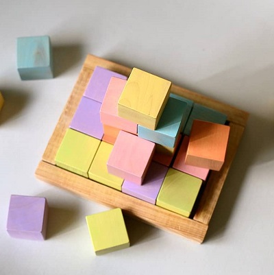 Процесс окунания, как правило, выглядит следующим образом: в емкость с цветным воском, опускают в сетке (сите) деревянные элементы, затем эта сетка поднимается, и воск стекает обратно. Далее, элементы протираются от излишков цветного воска и развешиваются сушиться на крючках или просто раскладываются на хлопковую ткань (не цветную!!!). В случае раскладывания игрушек для сушки на хлопковую ткань или иную поверхность следует обратить внимание, чтобы соприкосновение было со стороны поперечного среза древесины – больше впитываемость – меньше вероятность образования следов. Через час игрушки сухие. Для получения ярких и укрывных цветов мы предлагаем цветовую гамму от дизайнеров немецкой компании GRIMM’S –производителя детских игрушек. В этой коллекции 24 насыщенных цвета. При таком способе обработки, учитывая высокую концентрацию пигментных паст при соприкосновении (соударении, трении и т.п.) игрушек друг о друга, они оставляют друг на друге цветной след. Т.е. потерли зеленый кубик о красный и на красном кубике зеленая полоса – на зеленном наоборот, соответственно. Чтобы свести к минимуму этот эффект мы рекомендуем вариант 2.